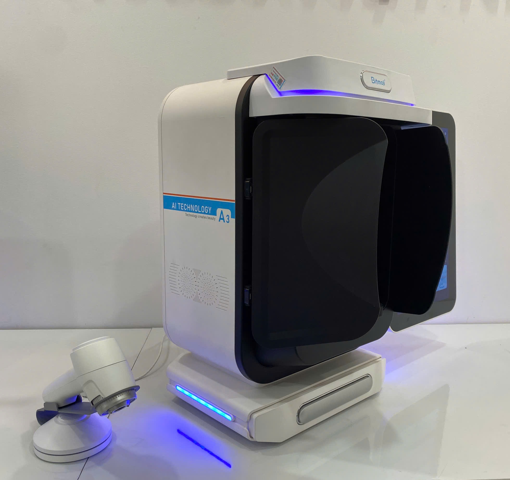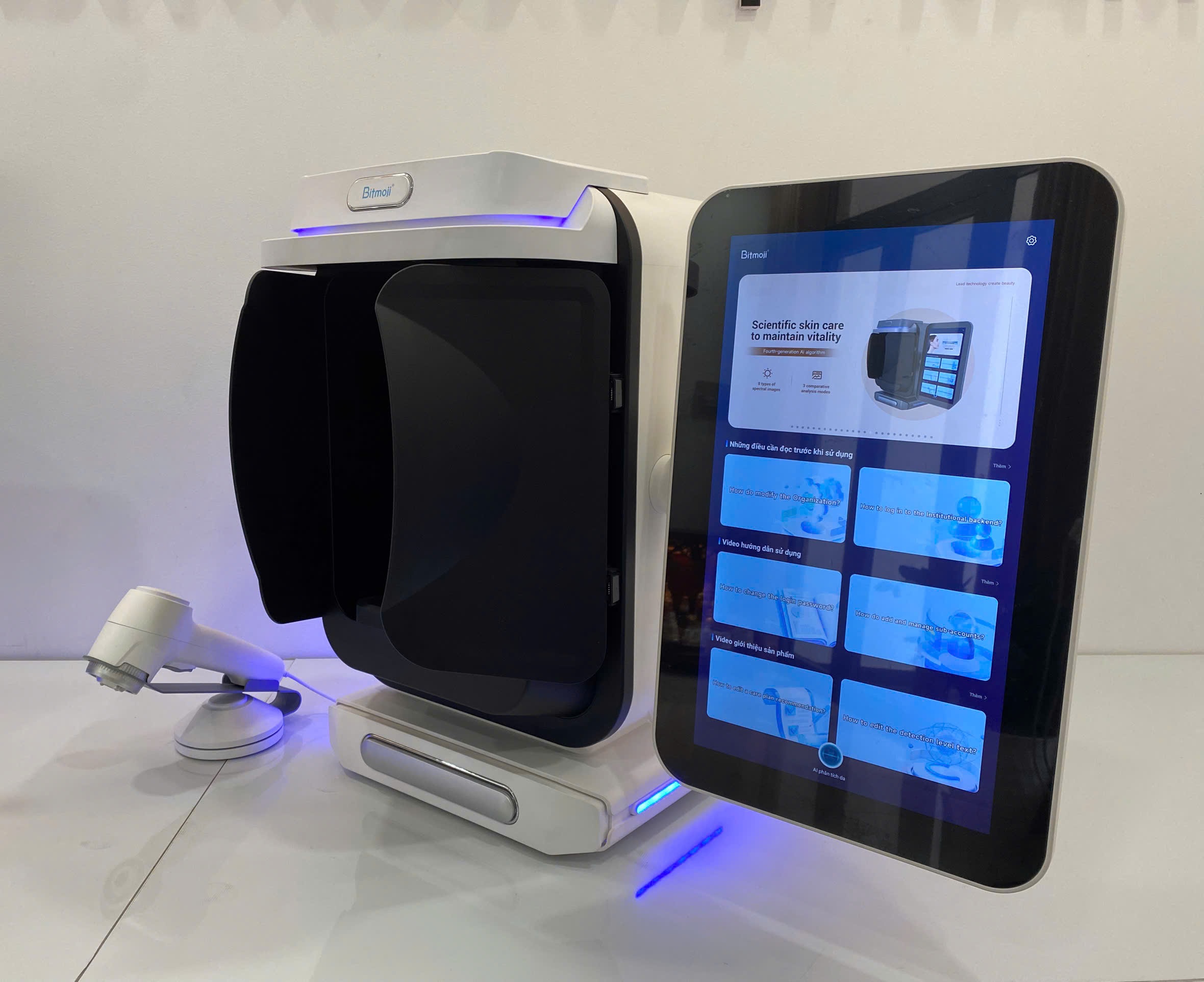 - Máy được trang bị các cảm biến tiên tiến có khả năng phân tích các yếu tố quan trọng của da như độ ẩm, độ đàn hồi, mức độ nhờn, sự hiện diện của nếp nhăn, sắc tố da và các dấu hiệu tổn thương do môi trường.
