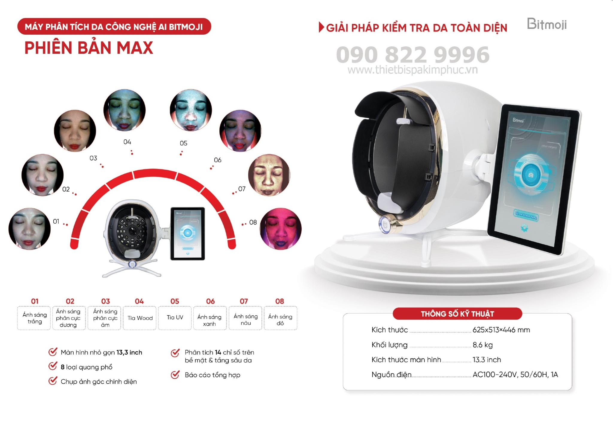 - Máy Phân Tích Da BITMOJI AI Max là một trong những thiết bị tiên tiến nhất hiện nay trên thị trường trong lĩnh vực hỗ trợ điều trị bệnh lý cho da. AI-MAX là lựa chọn lý tưởng cho các cơ sở thẩm mỹ và spa cao cấp hoặc tầm trung, bởi AI MAX có mức giá vô cùng ưu đãi, giúp nâng cao chất lượng dịch vụ và đáp ứng nhu cầu ngày càng cao của khách hàng.