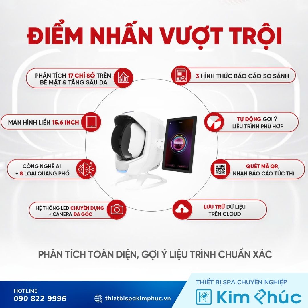 Các chỉ số hiển thị: Kết quả bao gồm các chỉ số quan trọng về da như: độ ẩm, lượng dầu, kích thước lỗ chân lông, độ sâu nếp nhăn, mật độ sắc tố (nám, tàn nhang), độ nhạy cảm của da, tình trạng mụn ẩn, tổn thương do UV, v.v.