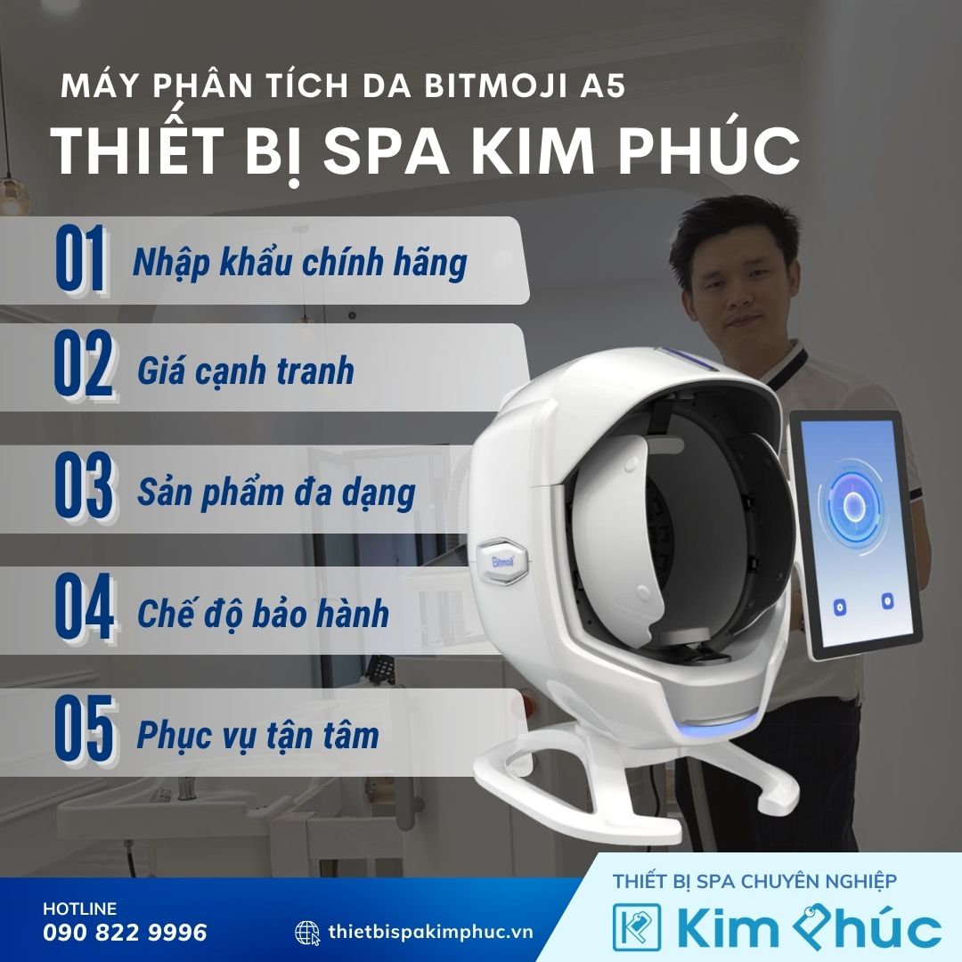 Để sở hữu máy phân tích da Bitmoji A5 chính hãng và nhận được sự hỗ trợ tốt nhất, hãy liên hệ ngay với Thiết bị spa Kim Phúc. Chúng tôi tự hào là đối tác cung cấp các thiết bị spa hàng đầu với chính sách sản phẩm chính hãng, đảm bảo chất lượng mang đến kết quả tối ưu cho thẩm mỹ viện của bạn. Tại Thiết bị spa Kim Phúc, bạn không chỉ mua được sản phẩm chất lượng cao mà còn nhận được sự tư vấn tận tình, hướng dẫn sử dụng chuyên nghiệp và chế độ bảo hành chu đáo.
