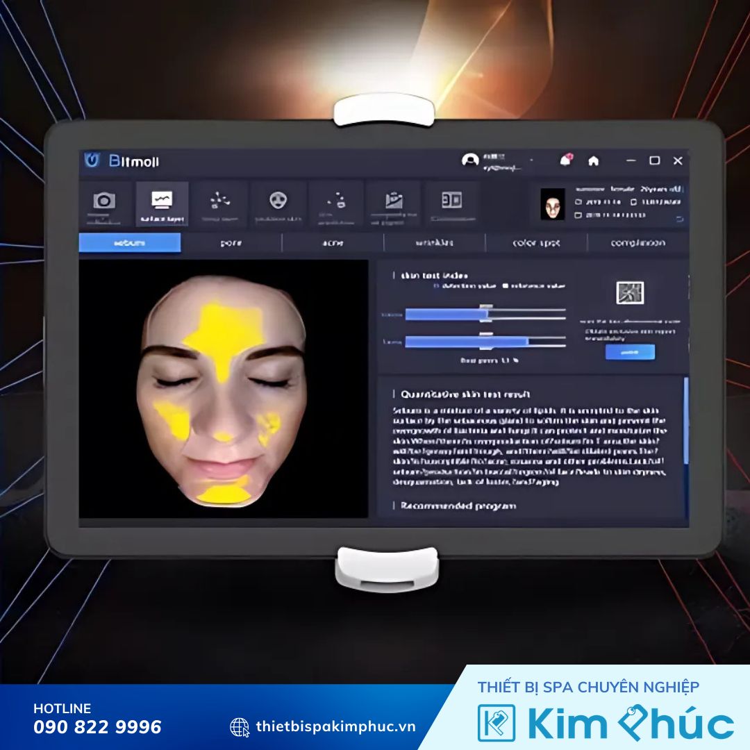 Bên cạnh đó, máy còn được trang bị hệ thống quản lý dữ liệu khách hàng thông minh, cho phép lưu trữ hồ sơ, theo dõi tiến trình cải thiện của da qua từng buổi trị liệu và xây dựng các liệu trình cá nhân hóa dựa trên lịch sử phân tích. Giao diện trực quan, dễ sử dụng của máy giúp kỹ thuật viên thao tác thuận tiện và dễ dàng giải thích kết quả bằng hình ảnh, biểu đồ cụ thể cho khách hàng. Cuối cùng, thiết kế chuyên nghiệp và hiện đại của các dòng máy Bitmoji (A3, Plus, Max) còn góp phần nâng cao tính thẩm mỹ và sự chuyên nghiệp cho không gian spa của bạn, tạo ấn tượng tốt với khách hàng.