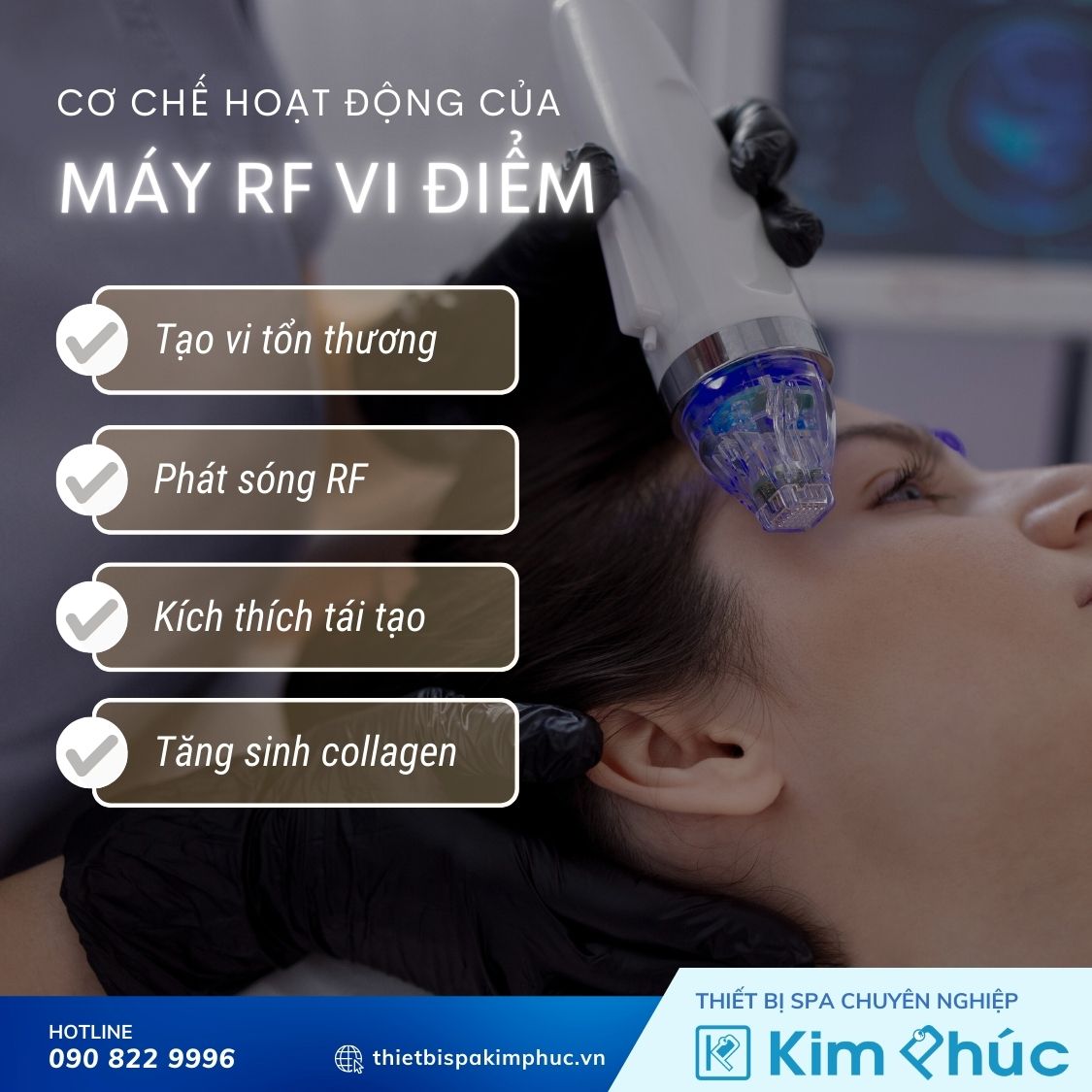 Máy RF vi điểm là thiết bị thẩm mỹ sử dụng công nghệ sóng radio tần số cao (Radio Frequency) kết hợp với hệ thống kim siêu vi điểm. Các đầu kim siêu nhỏ này sẽ xuyên qua lớp biểu bì, đưa năng lượng RF vào sâu trong lớp hạ bì, tạo ra nhiệt lượng kiểm soát. Nhiệt lượng này sẽ kích thích sản sinh collagen và elastin, đồng thời làm co rút các sợi collagen cũ, giúp: