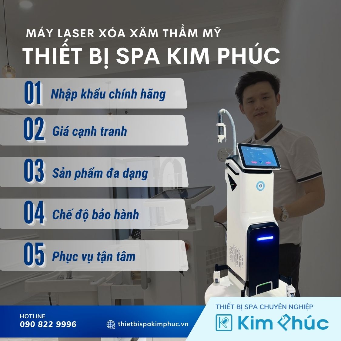 Vì vậy, thay vì quá tập trung vào việc tìm máy rẻ, bạn nên tìm địa chỉ mua hàng uy tín để đảm bảo thiết bị chất lượng và được hỗ trợ lâu dài. Một trong những gợi ý đáng tin cậy là Thiết bị Spa Kim Phúc. Kim Phúc ngày càng nổi tiếng trong việc cung cấp máy laser xóa xăm thẩm mỹ chính hãng, đa dạng phân khúc giá, đáp ứng cả spa nhỏ lẫn thẩm mỹ viện lớn. Bên cạnh đó, khi mua hàng tại Thiết bị spa Kim phúc, cơ sở spa, viện thẩm mỹ của bạn còn có chế độ bảo hành minh bạch, đào tạo kỹ thuật bài bản và luôn hỗ trợ khách hàng trong suốt quá trình sử dụng.