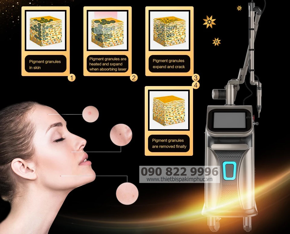 Máy Laser Picosecond Q-Switched ND SP-2 Sử dụng hiệu ứng nổ của laser Picosecond, nó thấm qua lớp biểu bì vào lớp hạ bì chứa khối sắc tố. Các xung laser tính bằng nano giây, năng lượng siêu cao. Điều này làm cho khối sắc tố phình ra nhanh chóng và vỡ thành những mảnh nhỏ, sau đó được loại bỏ thông qua hệ thống trao đổi chất của cơ thể. các sắc tố nằm ngoài cùng trên bề mặt da , còn những sắc tố lớn hơn sẽ bị làm vỡ thành nhiều phần tử nhỏ. Sau đó sẽ được đào thải ra ngoài cơ thể bằng máy hút.