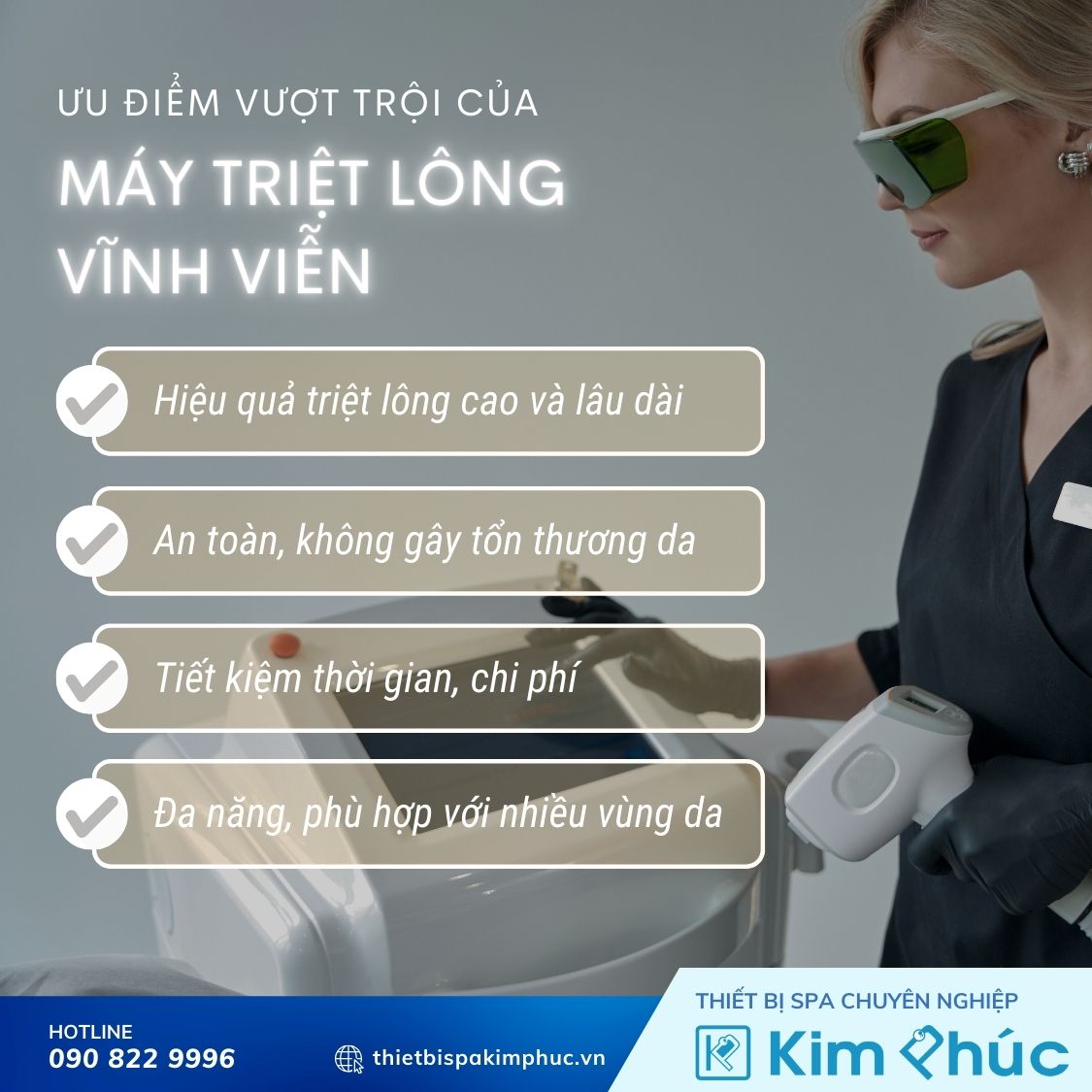 Kim Phúc là đơn vị cung cấp thiết bị thẩm mỹ chính hãng, chất lượng cao, bao gồm cả máy triệt lông vĩnh viễn. Kim Phúc thấu hiểu nhu cầu của các spa và thẩm mỹ viện, cam kết mang đến những giải pháp công nghệ làm đẹp tiên tiến, giúp bạn nâng tầm dịch vụ và thu hút khách hàng.