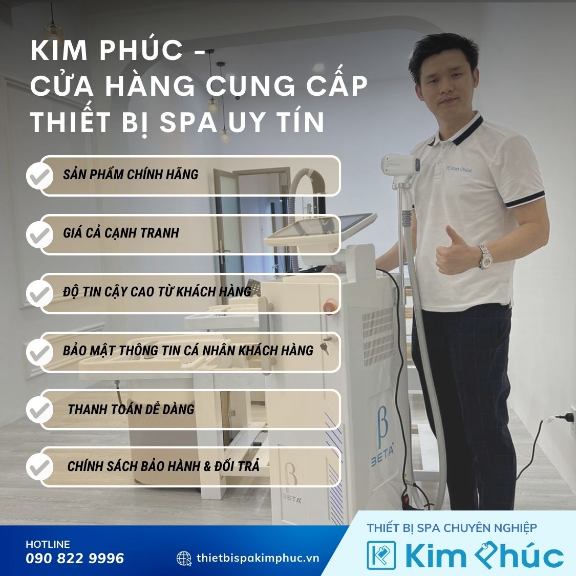 Với cam kết cung cấp thiết bị spa uy tín, chúng tôi tự hào là đối tác đáng tin cậy của nhiều spa trên toàn quốc. Chúng tôi luôn sẵn sàng hỗ trợ bạn phát triển spa của mình. Mọi thắc mắc hoặc nhu cầu tư vấn, xin vui lòng liên hệ với chúng tôi qua số hotline: 090 822 9996 hoặc gửi email đến support@thietbispakimphuc.com.