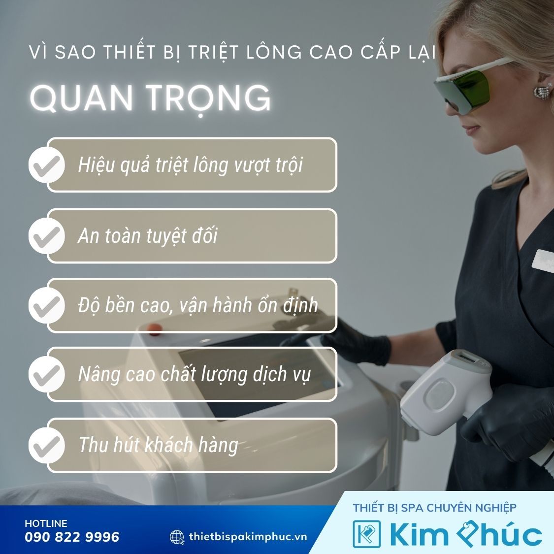 Đầu tư vào thiết bị triệt lông cao cấp là một chiến lược kinh doanh thông minh, giúp spa của bạn nâng cao chất lượng dịch vụ, thu hút khách hàng và tăng doanh thu. Hãy liên hệ ngay với Kim Phúc để được tư vấn và lựa chọn máy triệt lông phù hợp nhất!